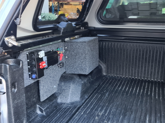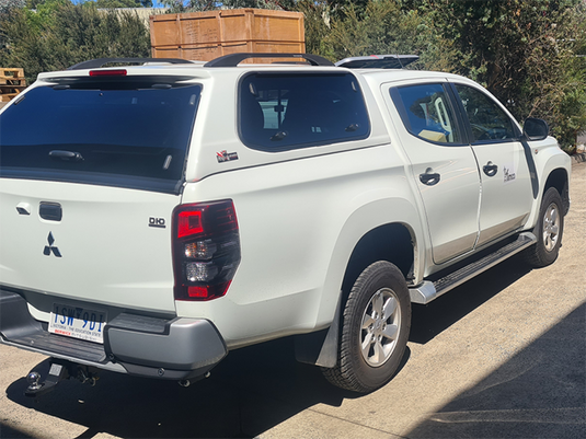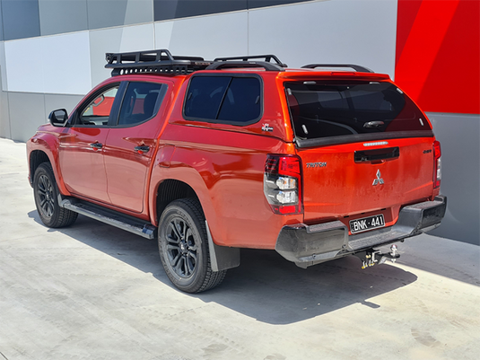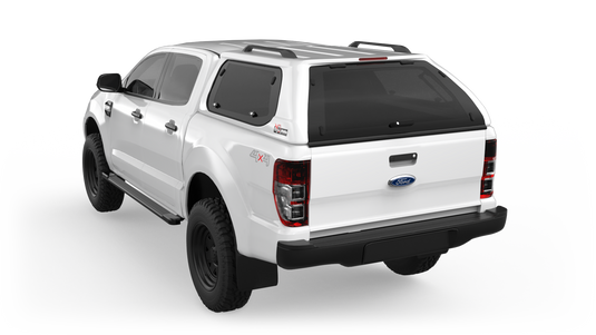 The Premium Fibreglass UTE Canopy has a stylish aerodynamic body design with integrated spoiler & LED brake light, tinted windows, roof rails, powerful gas struts, interior LED light, carpet lining, and rear window locking handle as standard.